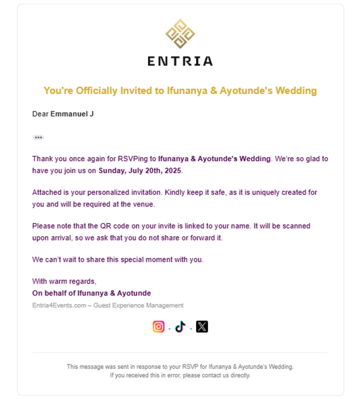 Every confirmed guest receives a personalized access pass with a unique QR code. On the event day, they scan it at the entrance for a smooth, one-scan check-in. You get real-time updates and keep uninvited guests out politely.
